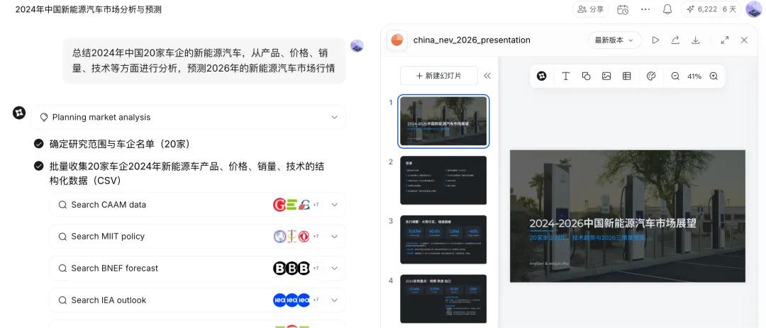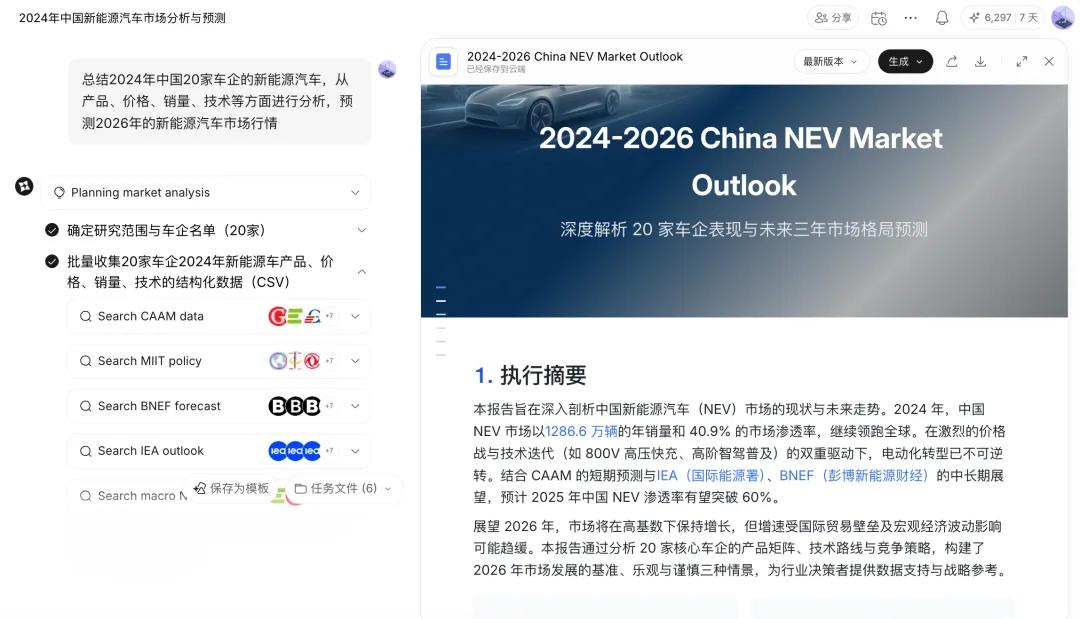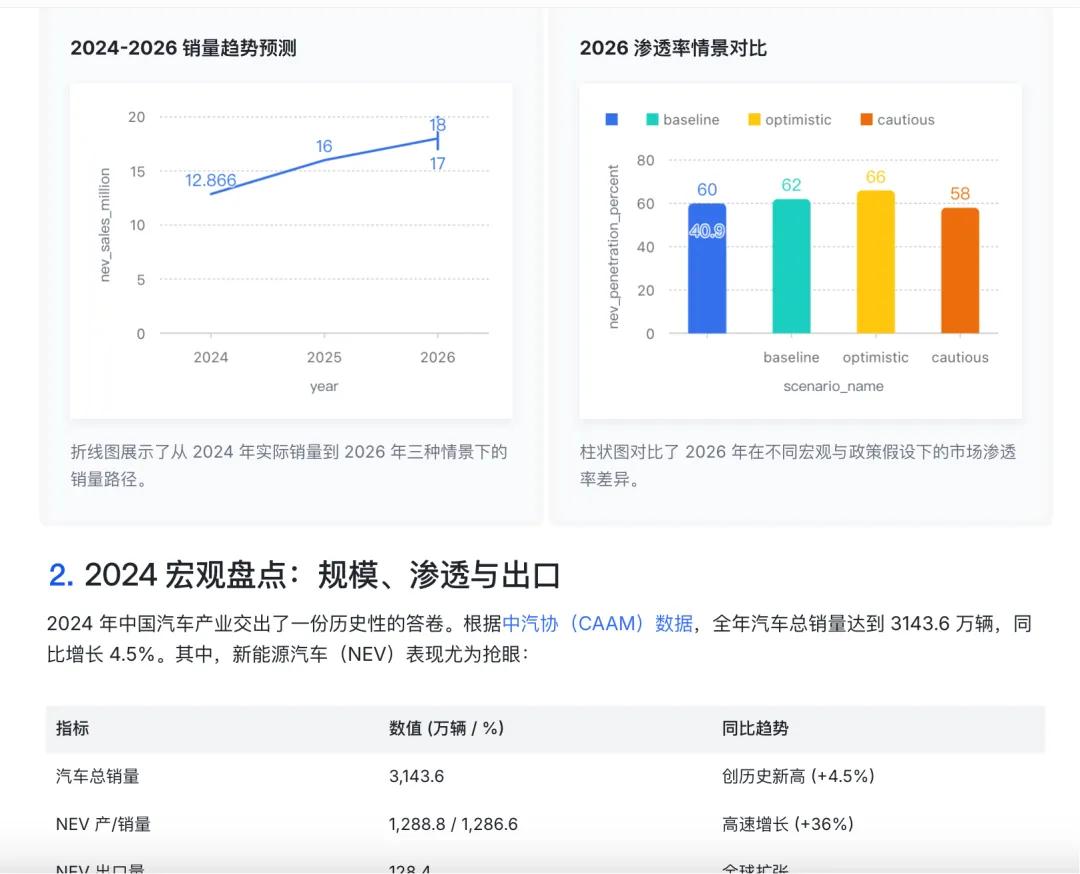比如让它总结20家车企的新能源汽车,从产品、价格、销量、技术等方面进行分析,预测2026年的新能源汽车市场行情。