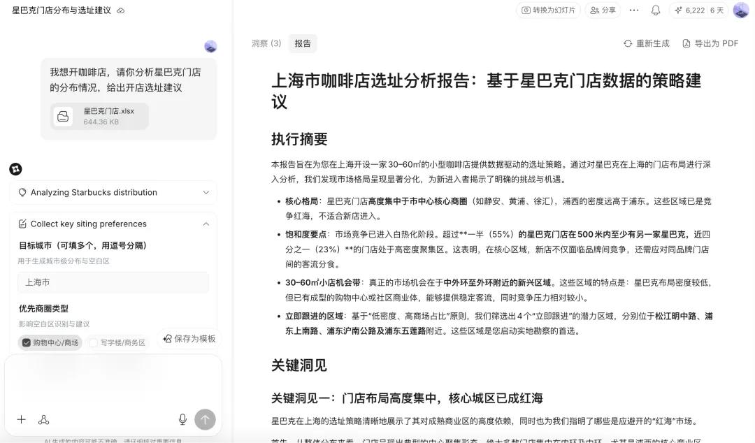 比如你只需提交一个excel表,AnyGen就能输出一份完成的分析报告,可以导出pdf、ppt。