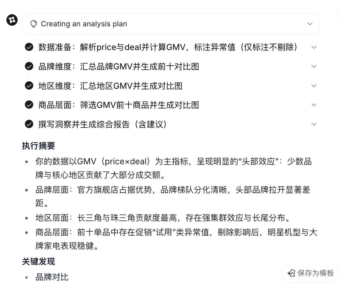 输出的结果包含洞察和完整报告,它从品牌、地区、商品等多维度分析了商品GMV表现,报告中的图表是可交互的,整个报告可导出PDF。