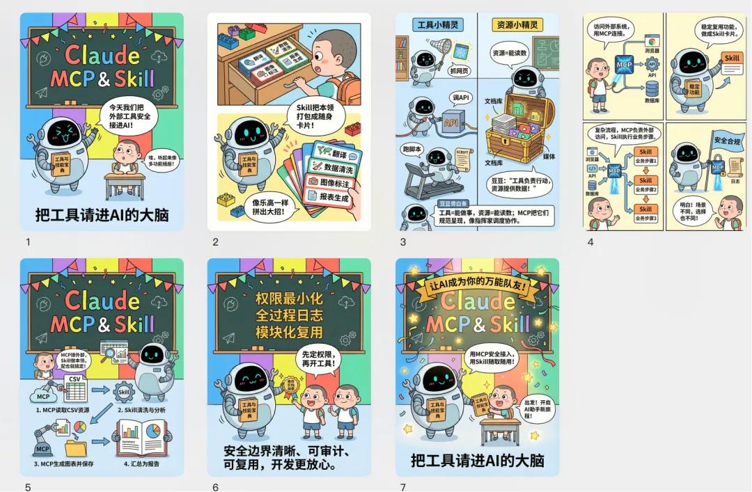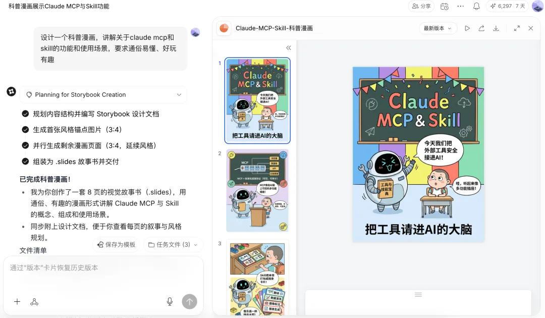 比如让它设计个漫画,讲解关于claude mcp和skill的功能和使用场景,要求通俗易懂、好玩有趣。