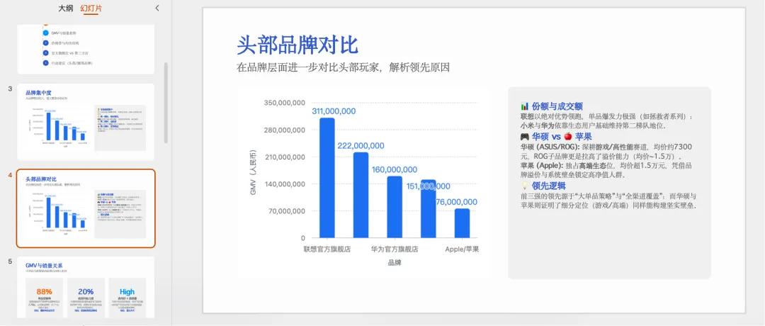 它支持将报告转换为PPT版本,生成的PPT除了图片外,其他都是可编辑的,虽然排版没那么花里胡哨,但结构清晰,我觉得改一改可以直接用于日常汇报。