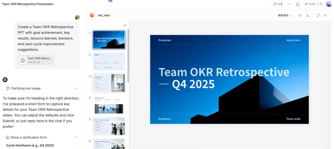 AnyGen则将对话式AI进行了功能延伸,不再只生成临时的单一形式答案,而是一步到位,支持在用户的个性化定制下,产出可交付的文件。