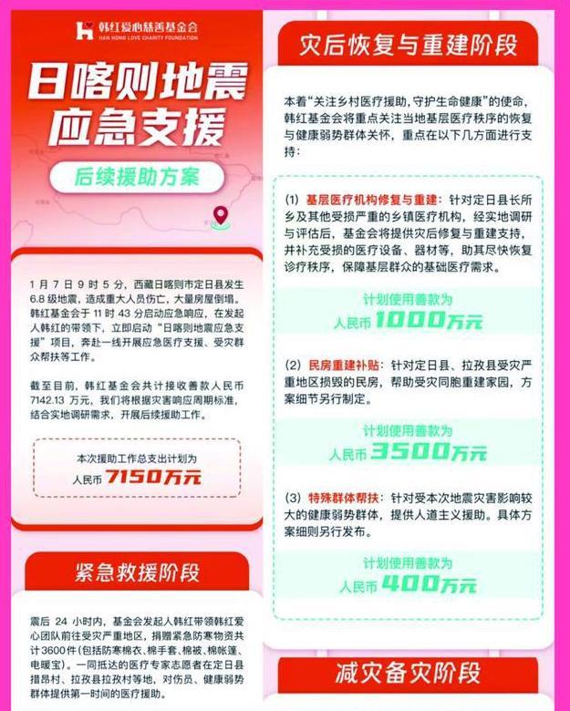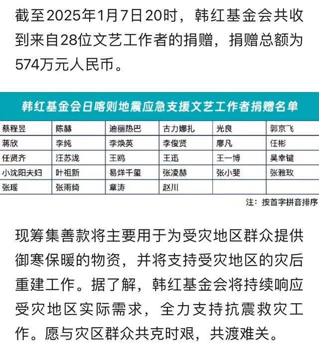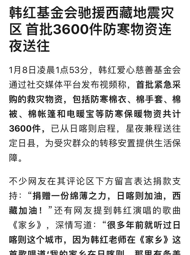 无论是西藏日喀则地震、美国加州山火还是韩国釜山客机失火,每当灾难发生时,韩红总是第一时间伸出援手。