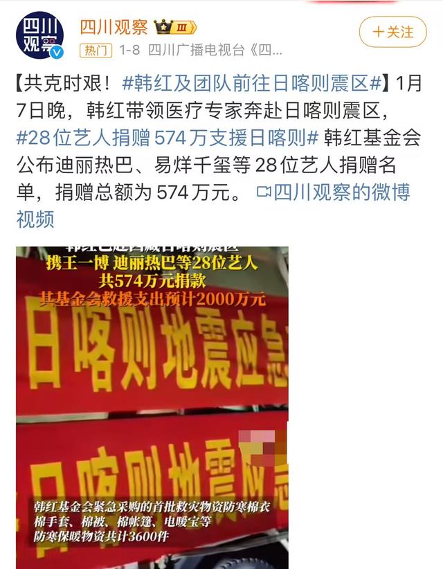 西藏日喀则地震后,韩红带领治疗团队连夜赶往灾区,为灾民筹集了6000万元善款,并亲自购买防寒棉衣、棉被等急需物资。