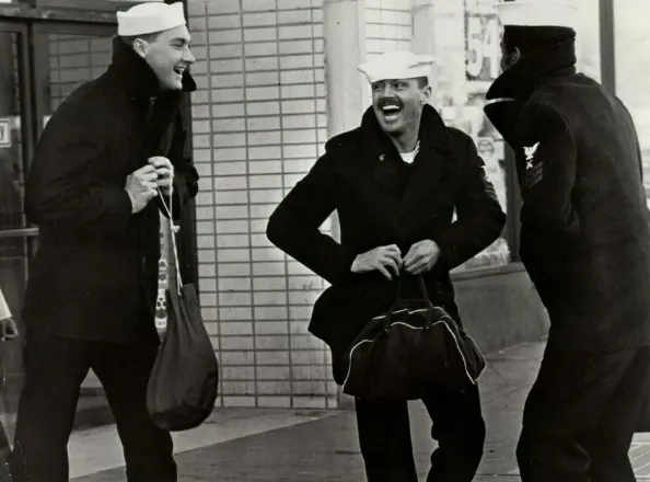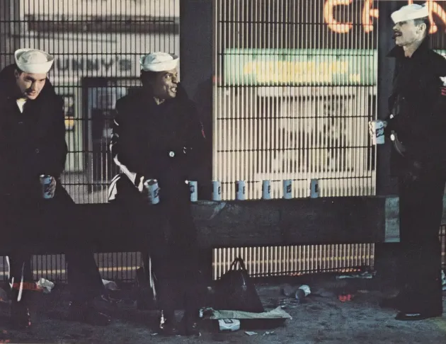 没有人能拒绝出去的诱惑,尤其是一群已经被枯燥的生活折磨的痛不欲生的水兵。于是,他们开始出去了,而出去并不仅仅停留在终点和起点,更多的时候,停留在过程。两个水兵刚好契合了过程的意义,对于现状不满的人遇到了另一个对于现状不满的人,即便他们属于押送和被押送的关系,但也无法阻止几个人相互理解且各自安抚。