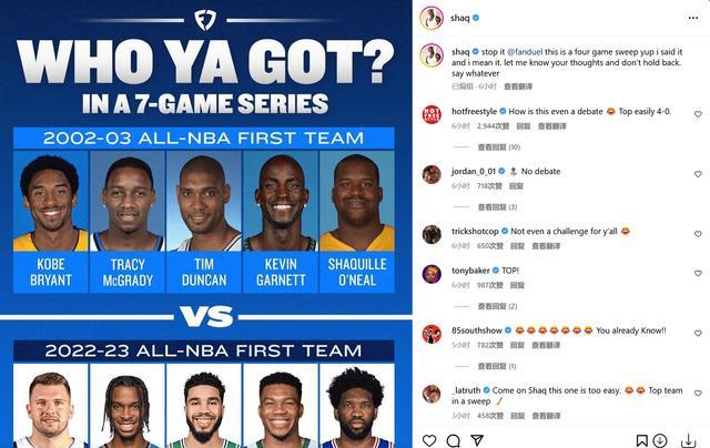 北京时间5月29日,NBA季后赛继续进行。在今天早些时候,美国媒体Fanduel晒出2002-03赛季NBA最佳阵容一队和本赛季最佳阵容一队的对比,NBA传奇球星奥尼尔称03年一阵可以横扫今年一阵。