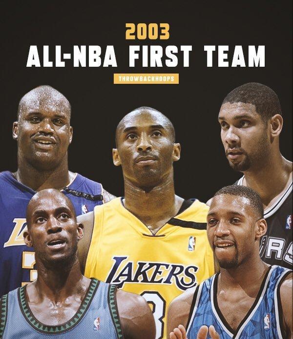 2002-03赛季的最佳阵容一队为:科比、麦迪、邓肯、加内特、奥尼尔;