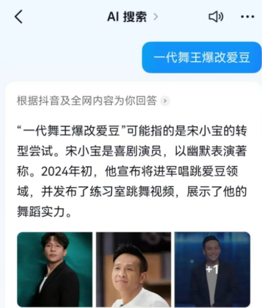 然而,最戏剧性的莫过于AI工具"豆包"的神回复——输入"一代舞王爆改爱豆"后,竟跳出宋小宝和罗志祥两个选项,让网友直呼"这波联动要是宋小宝,我直接笑到霸屏"。