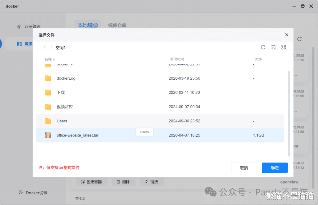 上传之后打开Docker,来到镜像管理选择添加镜像从设备添加,选择我们刚刚上传的镜像包导入。
