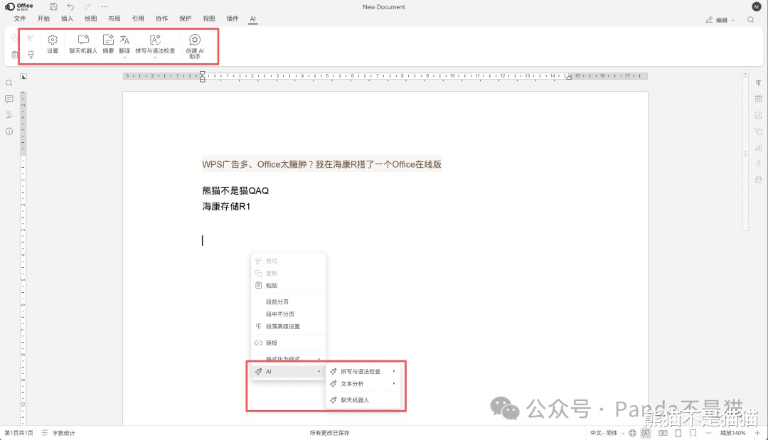 文档编辑和我们常规用的office大差不差,作为在线版它甚至还直接自己设置AI机器人用于翻译、智能摘要以及语法检查,功能比我想象中的要强大,当然AI需要自己配置。