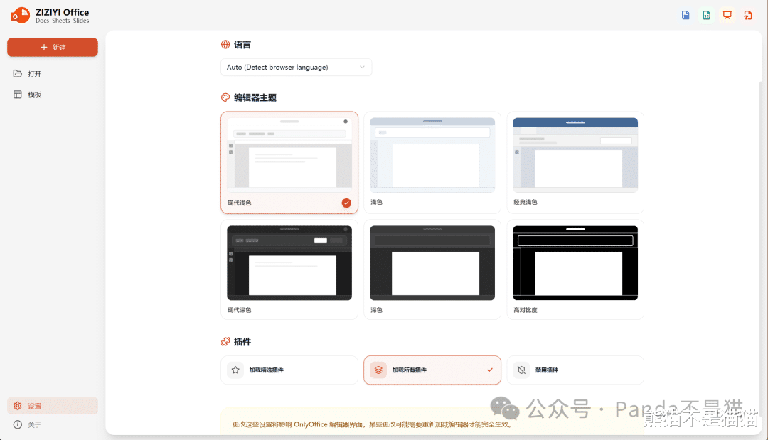设置界面支持调整编辑器的主题,同时底部能看到插件选择,选择之后需要重启编辑器才会生效。