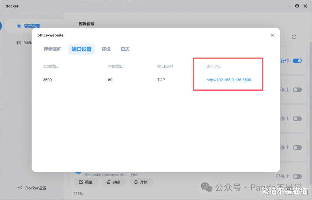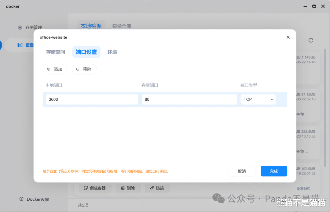随后选择创建容器,容器名称就叫office-website就行,存储空间因为并不涉及NAS上的数据存取,都是基于浏览器的本地存取所以不需要设置,我们只需要设置端口,添加容器端口80,本地端口随意不和其他容器冲突就行,类型选择TCP。