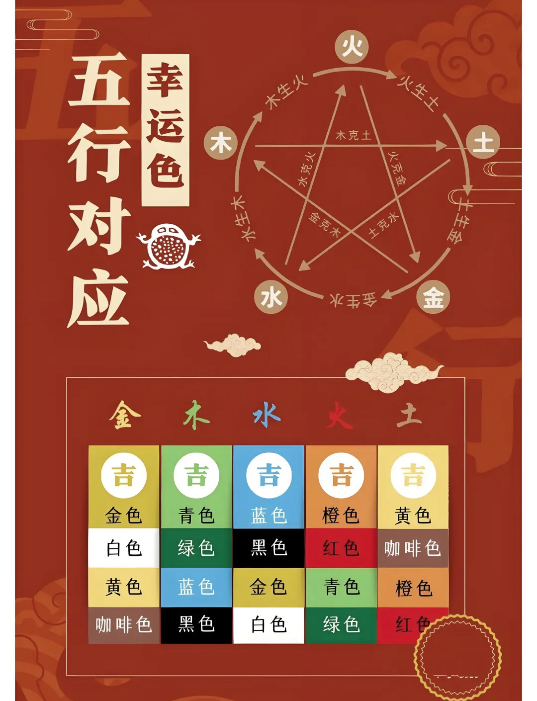 土色稳脾胃。灰棕助消化,防火旺伤土。女性在火年生育易热,用蓝黑可调激素平衡。整体,颜色影响色温疗法:冷色降温,暖色增能。