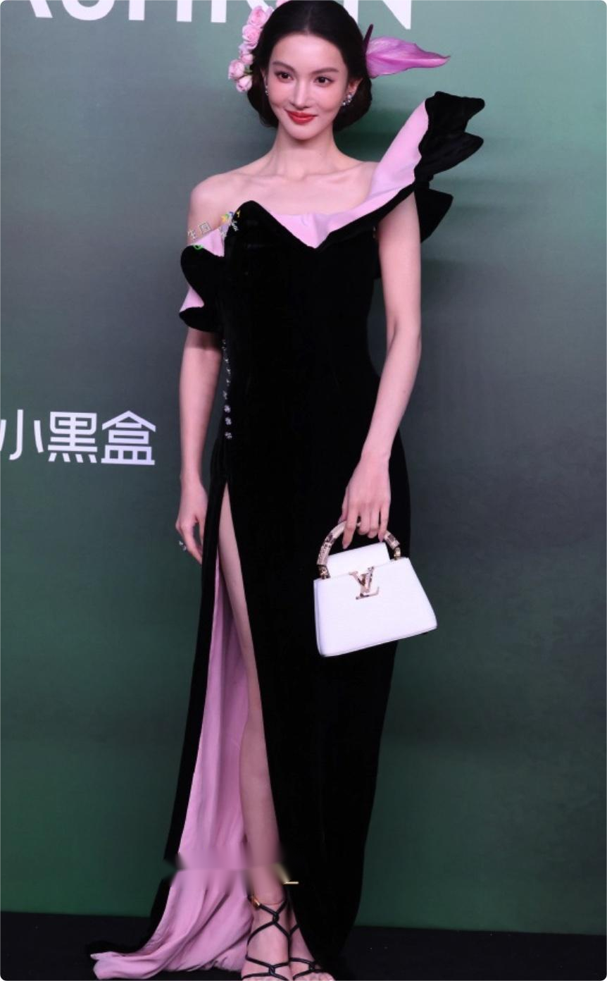 她一袭黑色修身礼服,线条干净利落,那双腿又细又直,比例逆天,完全是“漫画腿”模板。