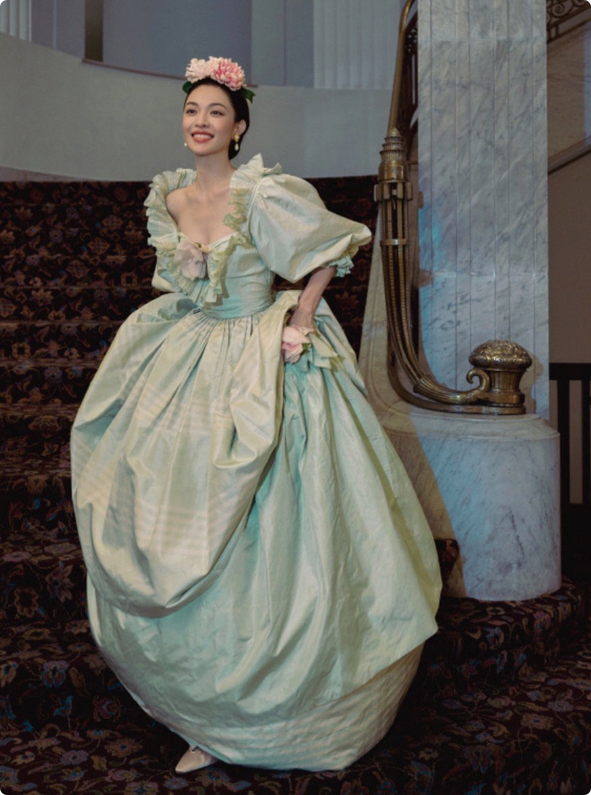 复古宫廷风设计,大裙摆、夸张肩型,很难驾驭却被她撑得刚刚好。