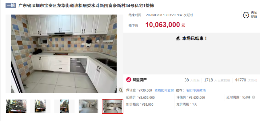 深圳龙华一栋7层私宅,起拍365.5万,成交1006.3万,溢价175%。38人争抢,212轮竞价。