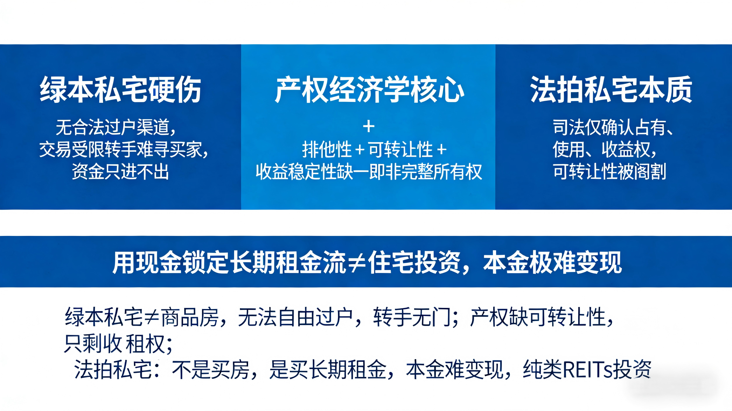 绿本私宅不能像商品房那样自由交易。没有合法的过户渠道,将来想卖,几乎找不到买家。这不就是一笔“只进不出”的买卖吗?