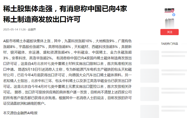 中国这边,先是给四家国内的稀土永磁体制造商开了绿灯,发了出口许可证。