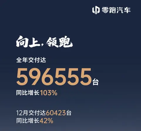1月1日,零跑汽车公布最新交付数据:12月,零跑全系交付达60423台,同比增长42%;全年交付达596555台,同比增
