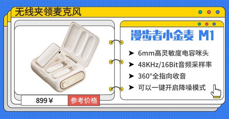 如果想找一款功能实用、操作简单的无线麦克风,可以考虑漫步者这款小金麦 M1。它内置 6mm 高灵敏度电容咪头,360° 全指向收音能各角度等量接收声音,还原清晰人声;48KHz/16Bit 音频采样率,能录制 CD 级无损音质。拥有一键降噪模式,搭配上AI 降噪算法,几乎没有多余环境杂音;而且适配手机、平板、单反等多种设备,即开即连不用复杂操作;搭配充电盒总续航高达 30 小时,还能实时查看电量状态,彻底解决电量焦虑。
