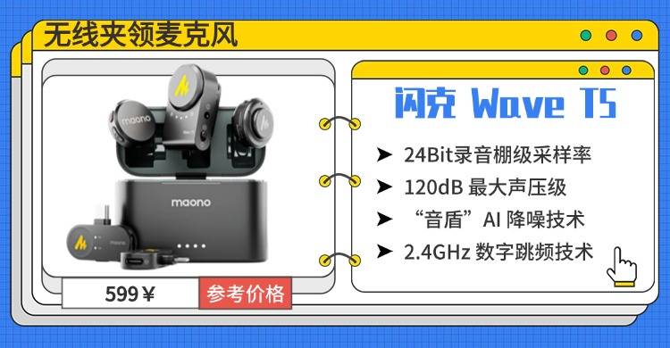 闪克 Wave T5 堪称“棚级音质标杆”。它搭载高灵敏度全向咪头,配合 24Bit 录音棚级采样率,拥有超 CD 级音质,细节丰富、层次感强;120dB 最大声压级能确保高声量录制不出现爆音,清晰还原人声细节和情感层次。还有它独创的“音盾”AI 降噪技术,可通过 APP 实现三档降噪 +14 级精调,搭配防风毛套,就算在户外嘈杂环境,也能精准捕捉人声。