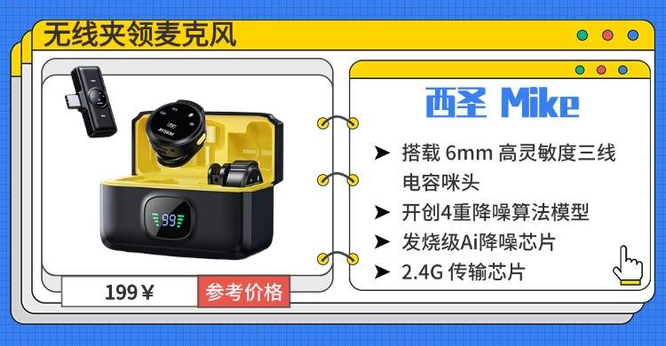 预算有限又想体验接近专业级收音的新手,西圣 Mike 是性价比黑马。它搭载 6mm 高灵敏度三线电容咪头,创新拾音技术让声音清晰度达 98% 以上;发烧级芯片和算法搭配 AI 抗风噪设计,能精准滤除环境杂声。加上有2.4G 传输芯片的加持,在200 米无遮挡环境下能保证稳定连接;还拥有48kHz/24Bit 采样率还原纯净人声,同时支持一拖二收音,双人创作也能轻松应对;9g 超轻机身佩戴无感,不会压垮衣领,4+20 小时续航满足一整天拍摄需求,价格还很亲民。