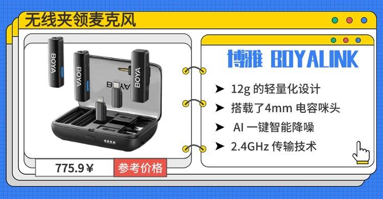 博雅 BOYALINK很适合夏天穿轻薄衣物,想要一款隐蔽性好、佩戴舒适的无线麦克风的创作者。它仅仅 12g 的轻量化设计,夹戴隐蔽方便,不会压垮轻薄衣物,佩戴体验很舒适。搭载了4mm 电容咪头+ AI 智能降噪 +一键主动降噪,能有效过滤各种杂音;2.4GHz 传输技术支持 100 米内开阔环境稳定连接,几乎没有断连情况;最高 30 小时的总续航,能满足长时间拍摄需求;配备 Type-C、Lightning 接口,即插即用,兼容性覆盖各种主流设备。