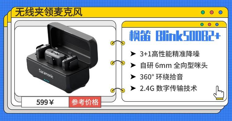 枫笛 Blink500B2+支持一拖二双声道收音,能分别收录两个人的声音,后期剪辑更灵活,适配多种多人创作场景。而且采用了自研 6mm 全向型咪头,360° 环绕拾音,能收录清晰细腻的人声,听感通透没有多余杂音;加上2.4G 数字传输技术抗干扰性强,信号连接稳定,不用担心断连问题;而且机身设计轻盈便携,收纳方便;能够兼容手机、相机、电脑等多种设备,场景适配性强;总续航高达 40 小时,完全能满足全天拍摄需求。