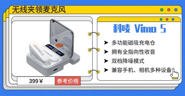看重便携性和操作便捷性的创作者,科唛 Vimo S这款就很不错。它的单麦仅 10g 超轻重量,就算长时间佩戴也没有负担;多功能磁吸充电仓支持智能数显,剩余电量一目了然。而且拥有全指向性收音覆盖广,48kHz 采样率保障基础音质清晰,日常拍 Vlog、录口播完全够用;双档降噪模式能有效过滤环境杂音;兼容手机、相机多种设备,即插即用不用复杂调试,新手也能快速上手,定价也比较适中。