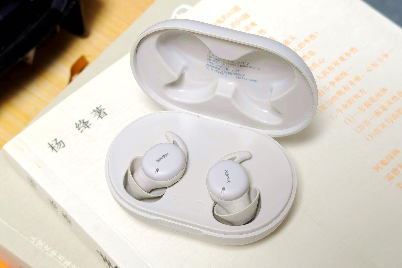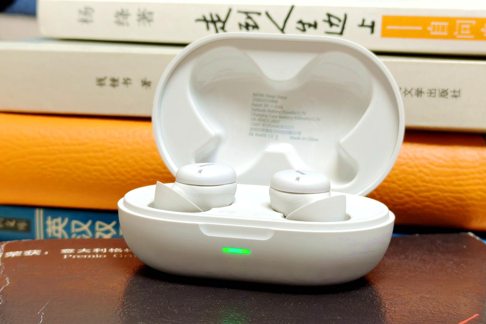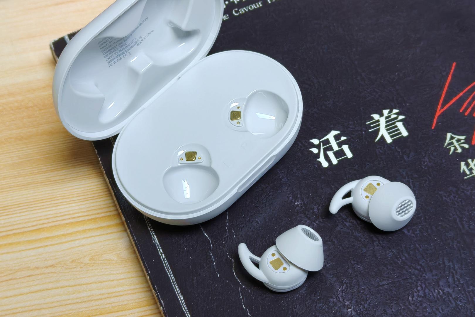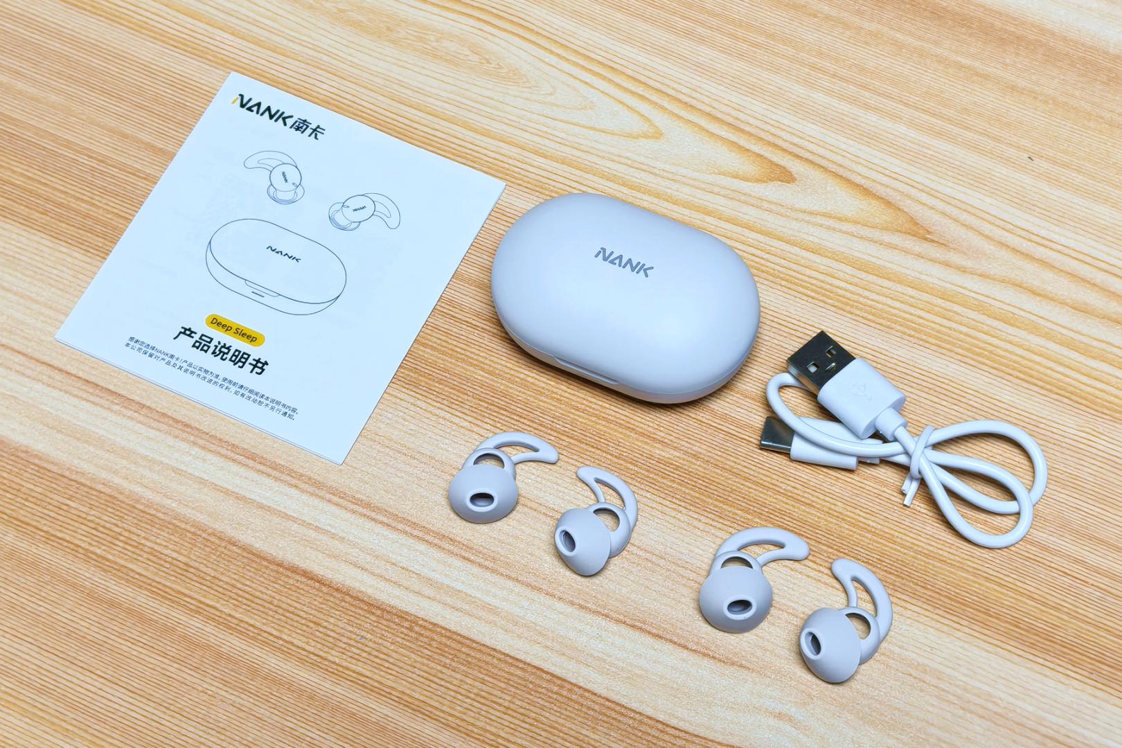 耳机采用简约的抽屉式设计,色调柔和完全不刺眼,透着一股静谧舒缓的调性,这和它"睡眠耳机"的定位相当契合。打开包装,内部布局整齐有序:耳机充电仓、耳机本体、Type-C充电线、三对不同尺寸的硅胶耳帽(加上耳机自带的一共三对),还有一本清晰易懂的使用说明书。