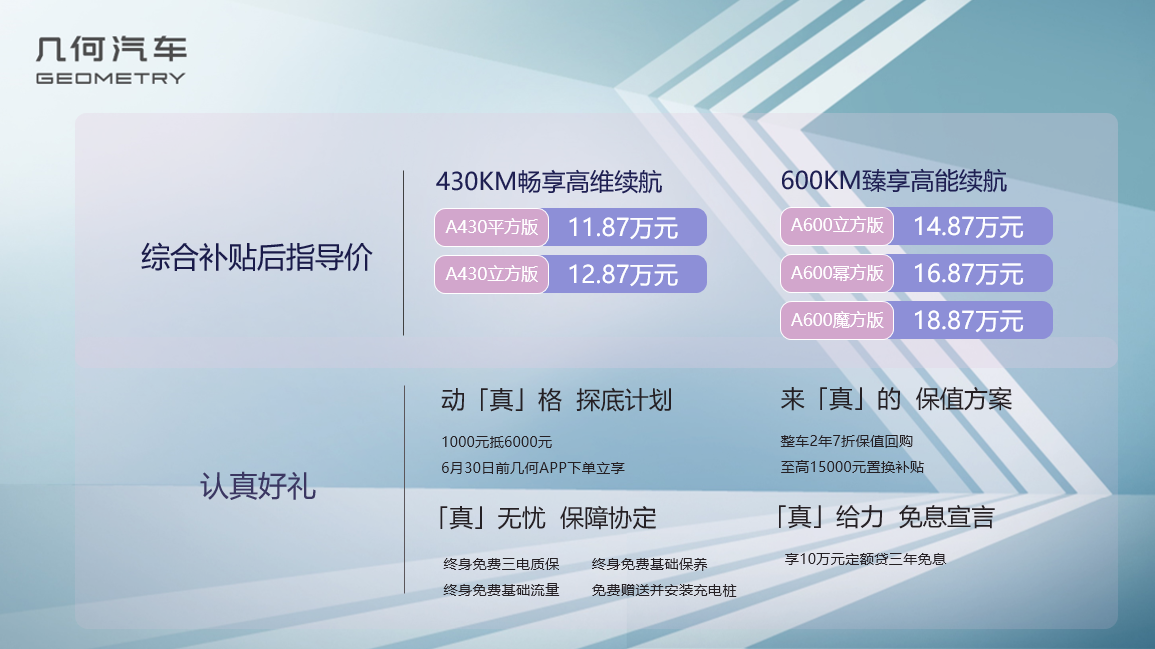 除了为用户提供“真”强的产品之外,几何汽车还针对新老车主推出了一系列优惠政策:几何A pro全系App下单1000元抵6000元,至高15000元置换补贴,可享10万元定额贷三年免息。与此同时,购买几何A Pro可享电池终身质保。