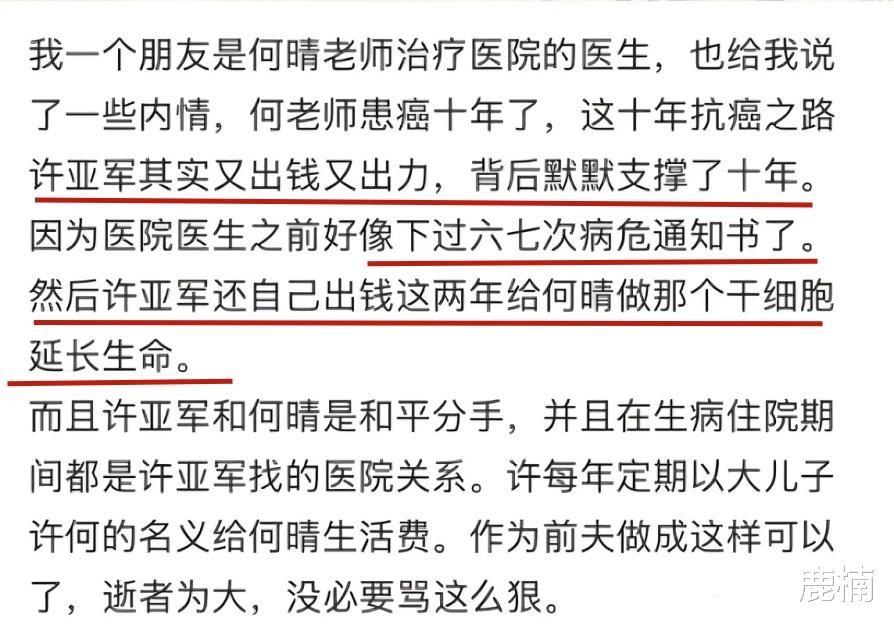 甚至在下了六七次病危通知书后,许亚军还出钱给何晴做干细胞移植。