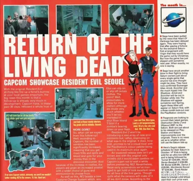 在显眼位置明确写着“バイオハザード2(生化危机2日文写法)”的字样,在杂志内还有彩图大篇幅介绍的游戏画面及玩法,说明在早期这就是个官方认可的版本甚至从侧页的世嘉土星LOGO来推测,本作极有可能还存在SS版本。