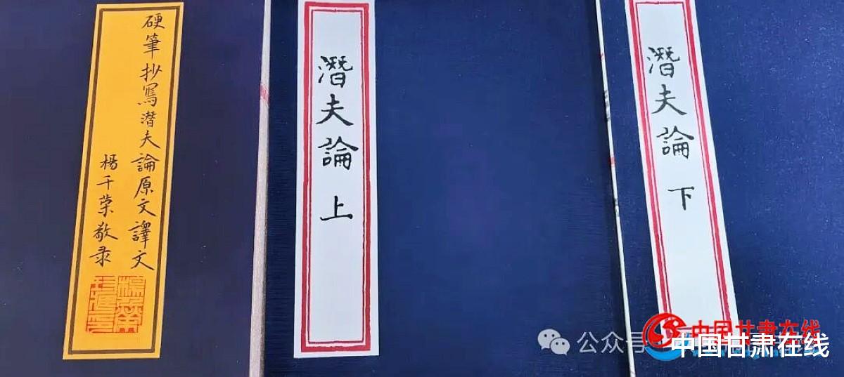 作为庆阳地区重要的公共文化服务机构,我馆始终致力于地方文献的收集、整理与传承。此次杨千荣同志捐赠的两部作品,因其独特的文化价值与地域属性,成为我馆馆藏体系中极具特色的珍贵资源。《潜夫论》为东汉末年安定郡(治所位于今甘肃镇原一带)先贤王符所著,是蕴含深刻思想的重要政论典籍,更是庆阳厚重历史文脉的鲜明标识,一直以来都是我馆地方文献研究与收藏的重点方向。杨千荣同志耗费数载心血,以精湛的硬笔书法精心抄录全文,全册字迹刚劲有力、章法严谨,既完整呈现了乡邦经典的原文风貌,又通过译文降低了当代读者的阅读门槛,更融入了抄录者对本土文化的深刻理解与深厚情感,集文献价值、书法艺术价值与地方文化研究价值于一体。