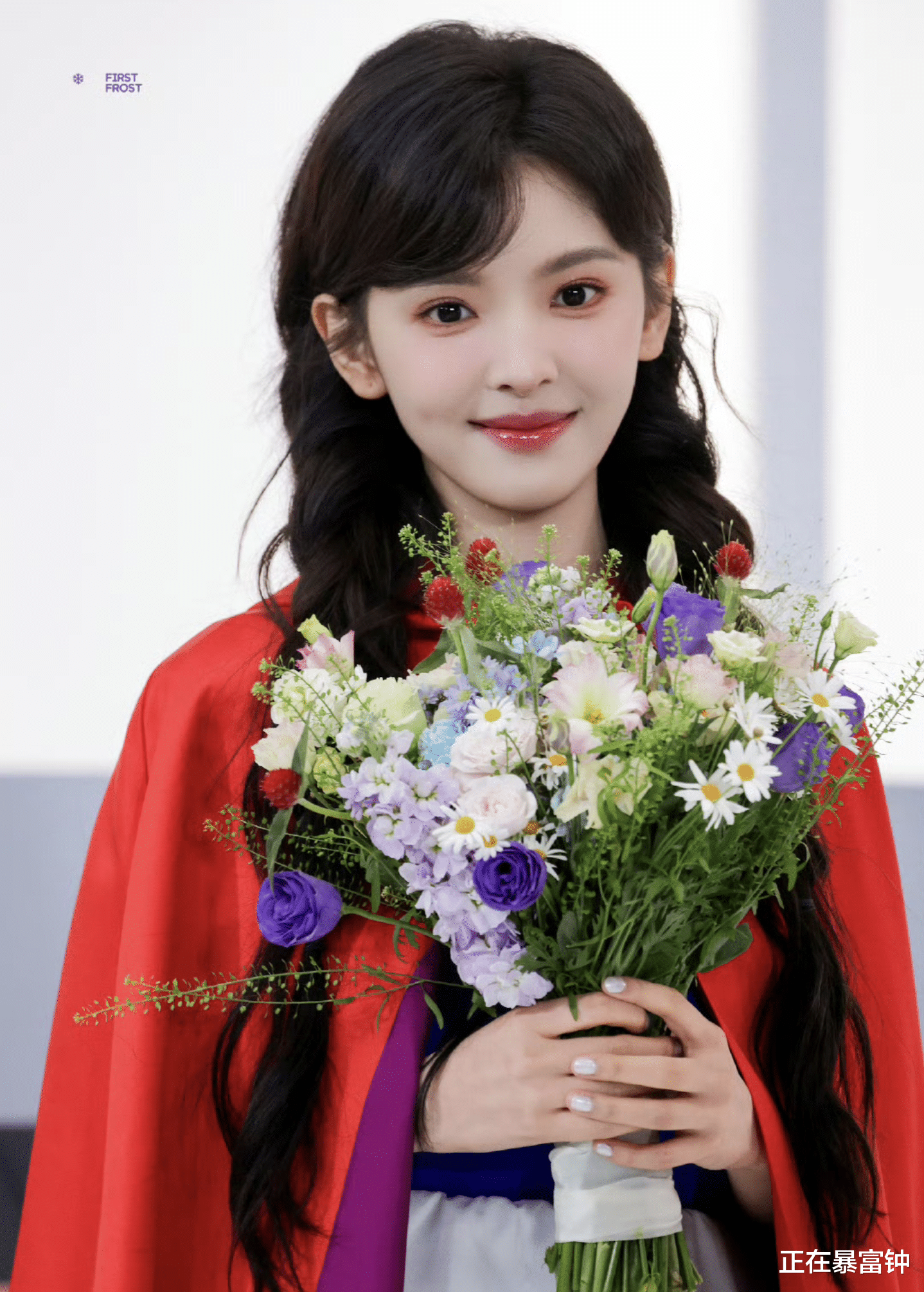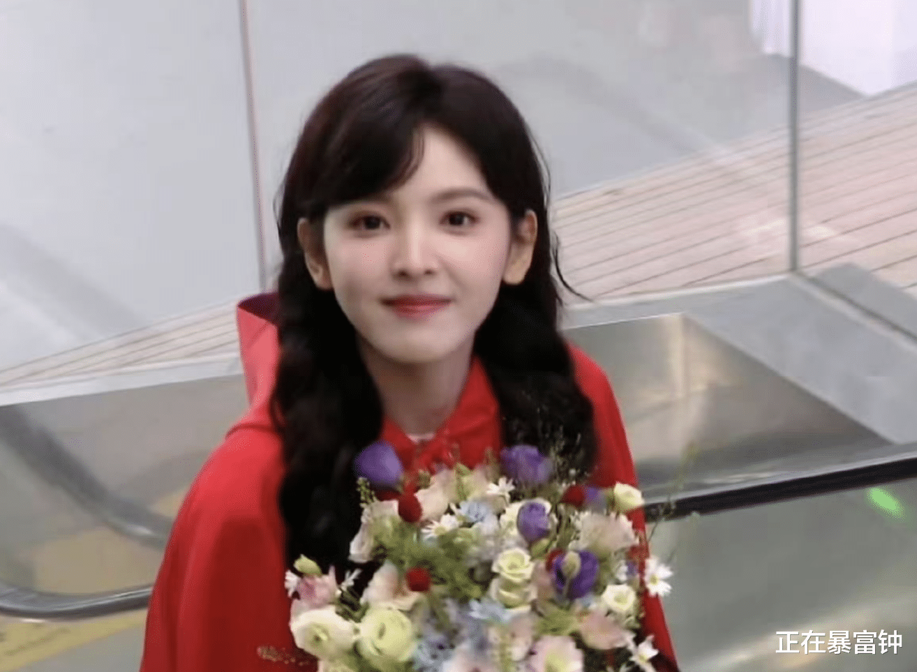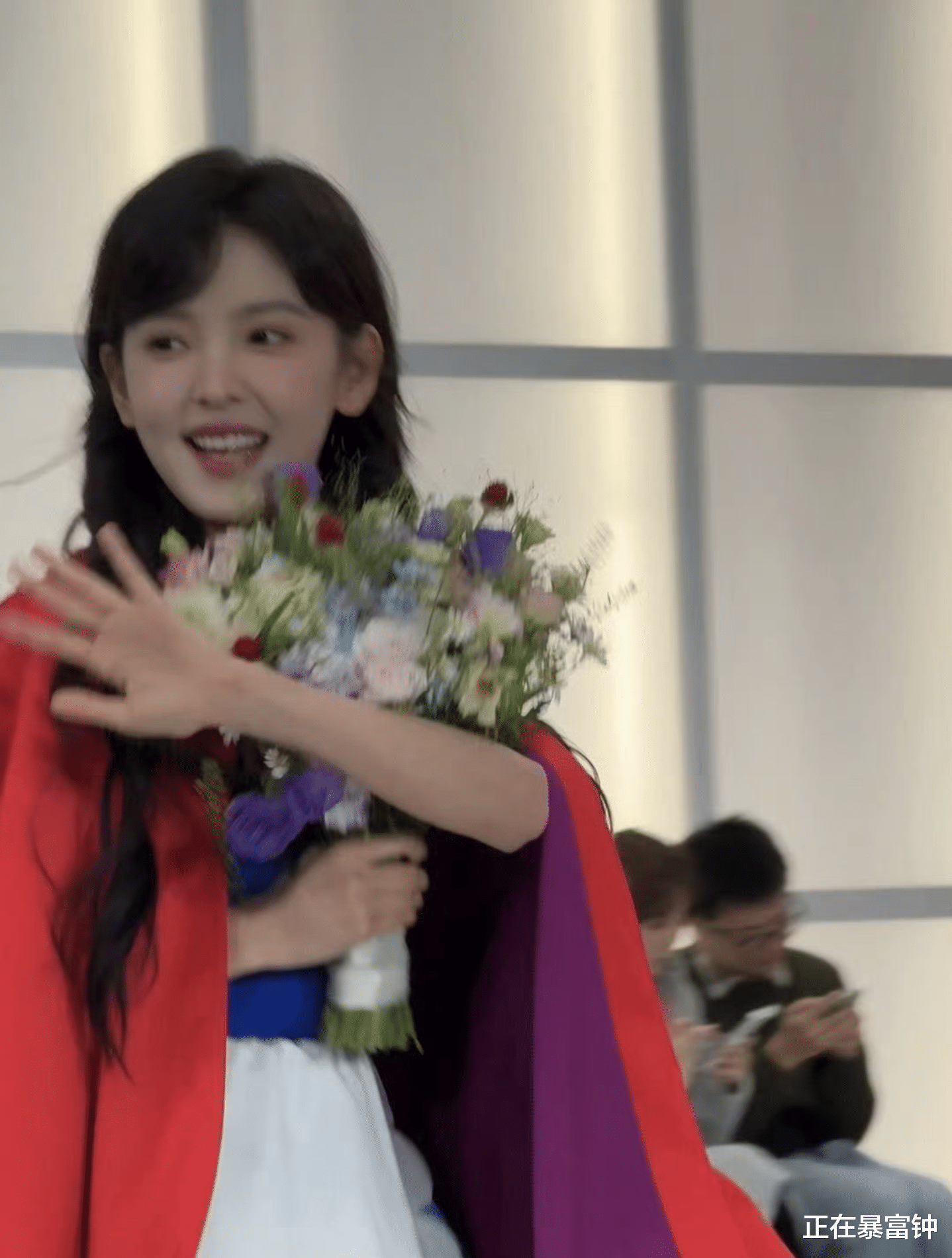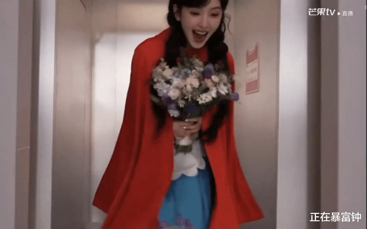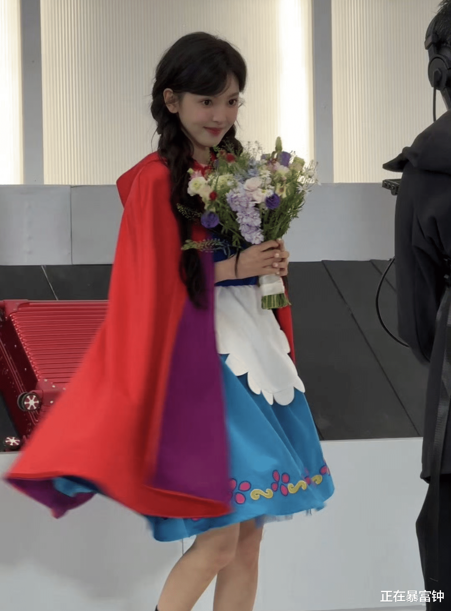 画面里她裹着一身正红色斗篷,活脱脱现实版“小红帽”,怀里还抱了一大束花,粉紫白配色衬得人嫩得能掐出水。结果刚迈两步脚底下一滑,整个人“duang”一下往前趔趄,手里的花差点飞出去——这姐们反应也是快,瞬间把花往怀里一搂,人站稳了直接仰头笑到露牙床,眼睛弯成月牙,连嘴角的梨涡都在“蹦迪”。