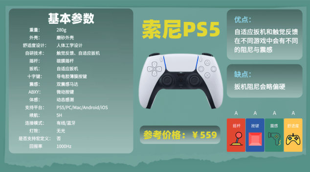 10、索 尼P S5游戏手柄:手柄主打舒适实用,外壳是细腻磨砂材质,摸起来干爽不粘手