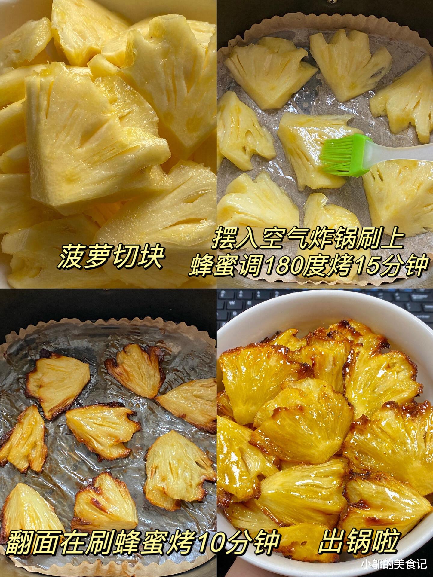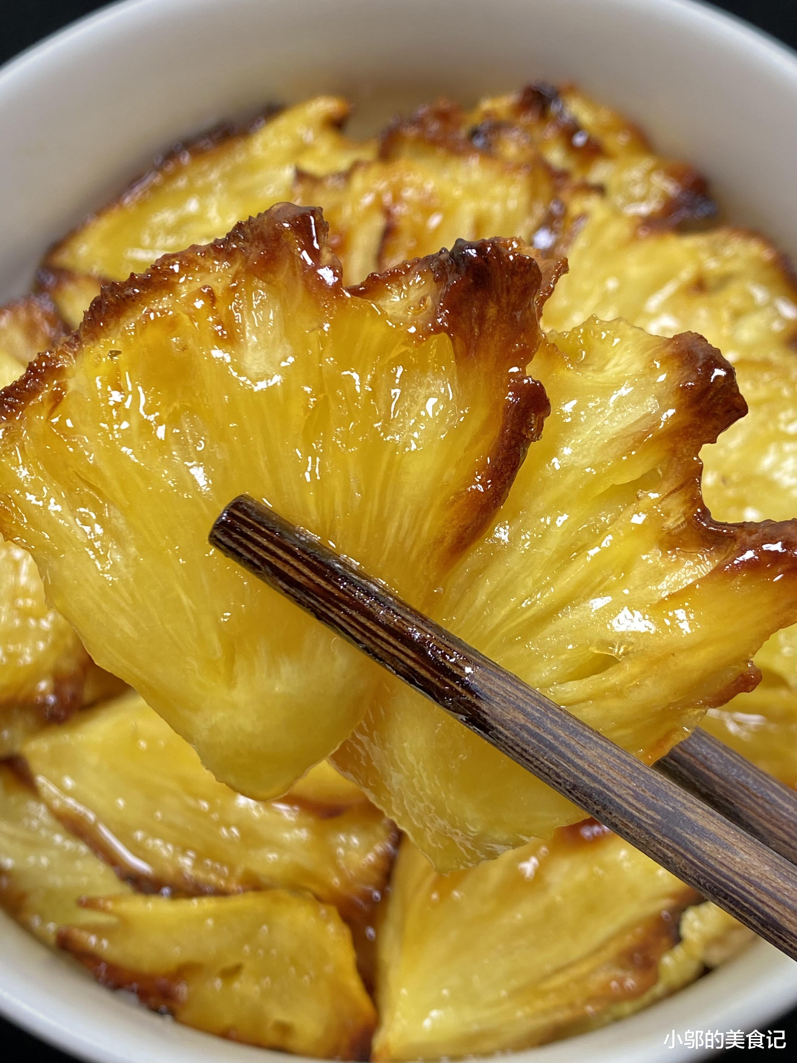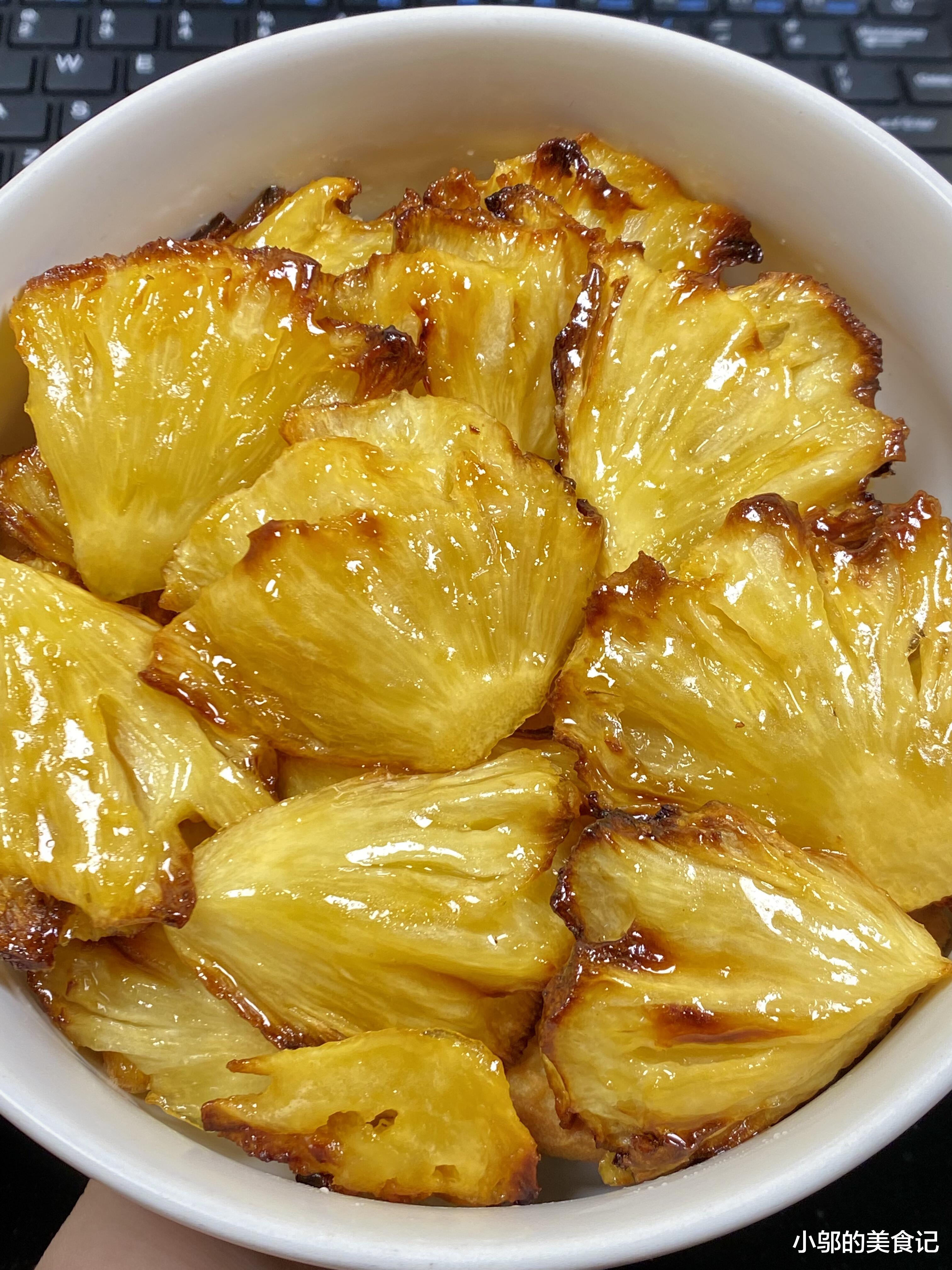 咬一口下去,蜂蜜烤焦的甜香,菠萝果肉的酸甜,经过烘烤的菠萝少了生涩的酸味,多了几分绵软,蜂蜜的甜刚好中和了菠萝的酸,吃起来甜而不腻,连吃好几块都不觉得齁。