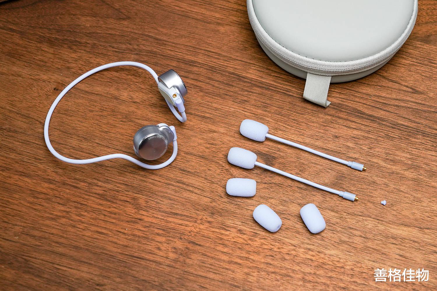 配件非常丰富,除了耳机本体、Type-C充电线、2.4G无线发射器、2个咪杆,还赠送了8套贴片、4个备用咪杆孔防尘塞,和3个咪杆防风罩。