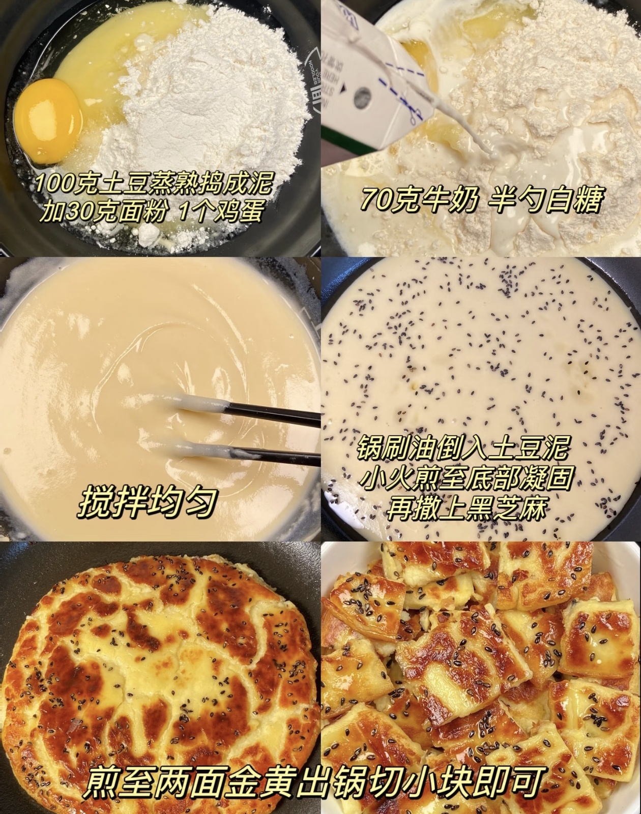 然后就可以起锅煎饼了。找一口平底锅,开小火预热,刷上一层薄薄的食用油,油不要太多,不然饼会变得油腻。等锅温热后,把调好的土豆面糊全部倒入锅中,用铲子轻轻铺平,让面糊均匀地铺满锅底。保持小火慢煎,这一步千万不能急,火太大容易把饼煎糊,里面却还没熟透。煎到底部微微凝固,表面也变得半透明时,撒上一把黑芝麻,既能增香又能让颜值翻倍。