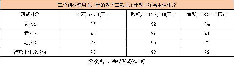 测评方法:找3名之前没有用过血压计的老人分别使用这三款血压计,测量过程中观察每款设备的功能是否智能,并对智能化进行打分。