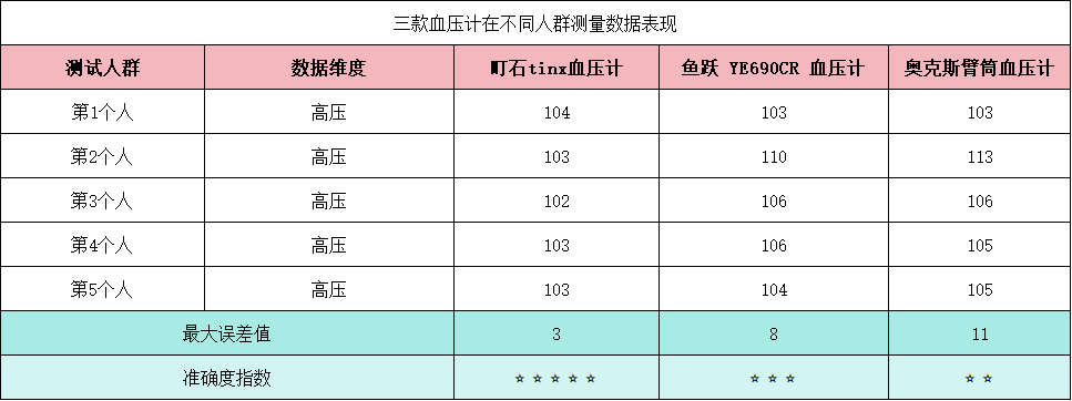 测评方法:找了5个平时有高血压的人来测量,然后观测每次的高压数据表现和最大误差值表现。