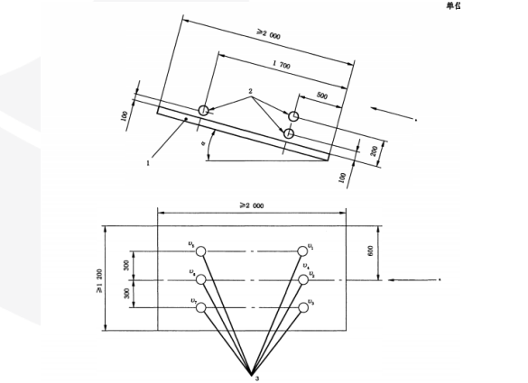 距离校准板底端 500 ± 5 mm 处设 4 个点(v1、v2、v3、v4),其中 v1、v2、v3 距板垂直距离 100 ± 5 mm,v4 距板 200 ± 5 mm;