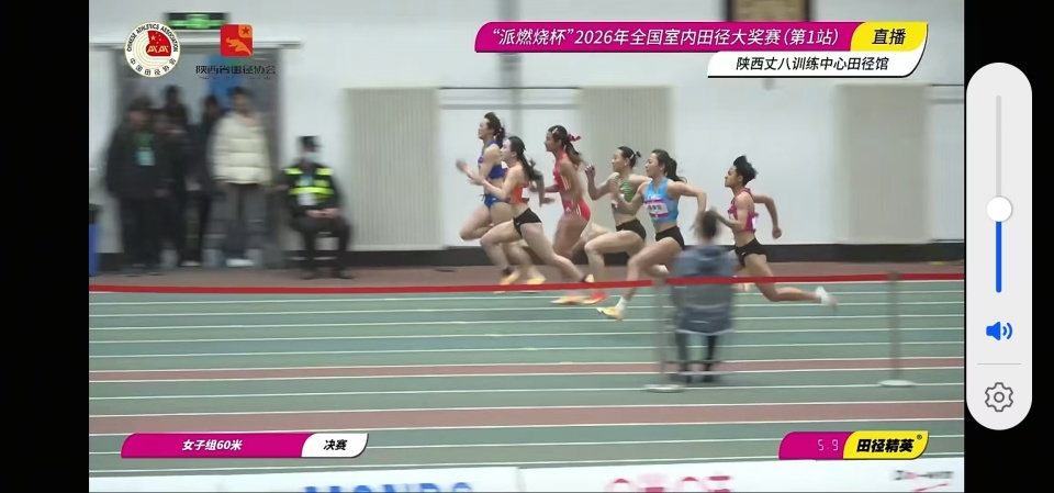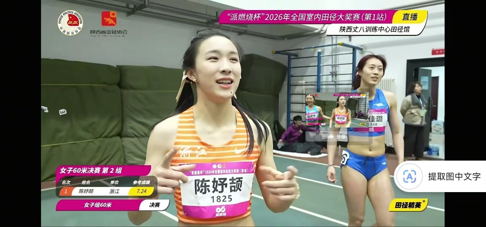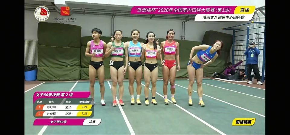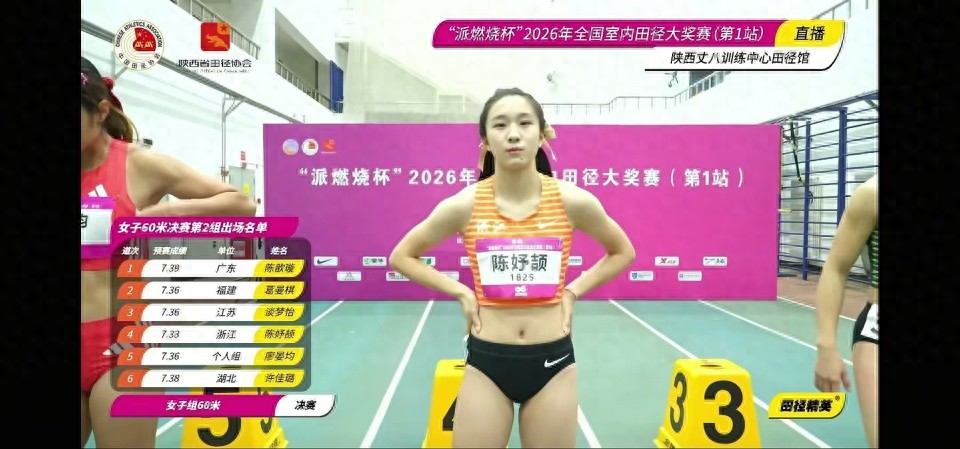 北京时间3月7日,2026年全国室内田径大奖赛(第1站)在西安的陕西丈八训练中心田径馆进行。刚刚结束的女子60米决赛,刚满17岁不久的陈妤颉在2026赛季首场比赛里就以7秒24轻松夺冠,她就此刷新了去年年初跑出的该项目个人最好成绩。本月托伦室内世锦赛该项目直接达标成绩是7秒20共56个参赛席位,按照动态入围排名陈妤颉暂时排名并列第45位,很有希望拿到一张门票。