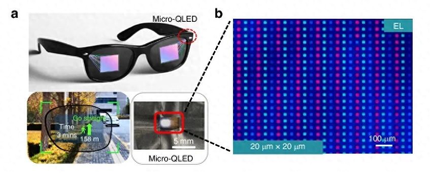 全彩色显示:通过在蓝色QLED上覆盖红、绿两色量子点光转换层,团队成功制出分辨率达1184 PPI的全彩色微显示屏,色彩覆盖率达NTSC标准的95.8%,画面鲜艳逼真。