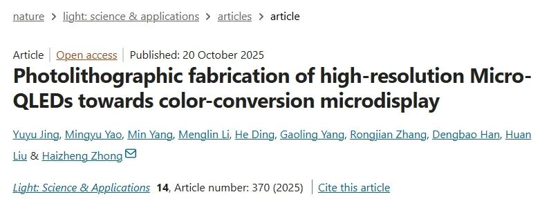 10月20日,一项发表于国际顶尖光学期刊Light: Science & Applications的研究成果,Photolithographic fabrication of high-resolution Micro-QLEDs towards color-conversion Microdisplay,为下一代增强现实(AR)与虚拟现实(VR)设备的显示技术带来了突破性进展。由北京理工大学钟海政教授团队领衔,联合多家科研单位,成功开发出基于光刻工艺的高分辨率全彩色量子点发光二极管(Micro-QLED)微显示屏。该研究不仅实现了目前同类器件中最高的像素密度,还展示出优异的发光效率与亮度,为微显示技术的低成本、大规模制造提供了全新路径。
