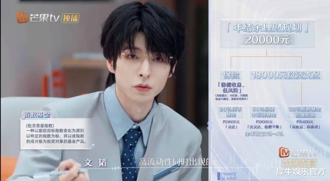 尤其是当看到文韬拆完一个职场人的收支结构省出2万元做了一个“年结余理财规划”(比如花15%预算买保险、投20%到货币基金里、再拿50%放国债和中短债基金里稳健收益、最后30%搏一搏指数基金或宽基指数),犀牛君第一反应是,这种财务规划也太清晰和实用了吧!但随后的第二反应就是,这个15%购置保险的比例,是不是刚好对应了冠名商的业务范围?