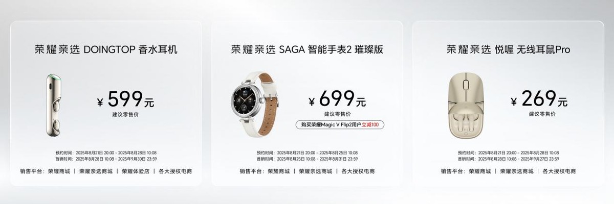 荣耀Magic V Flip2系列已于8月21日在荣耀商城和各大授权电商平台开启预售,将于8月28日10:08正式开售。