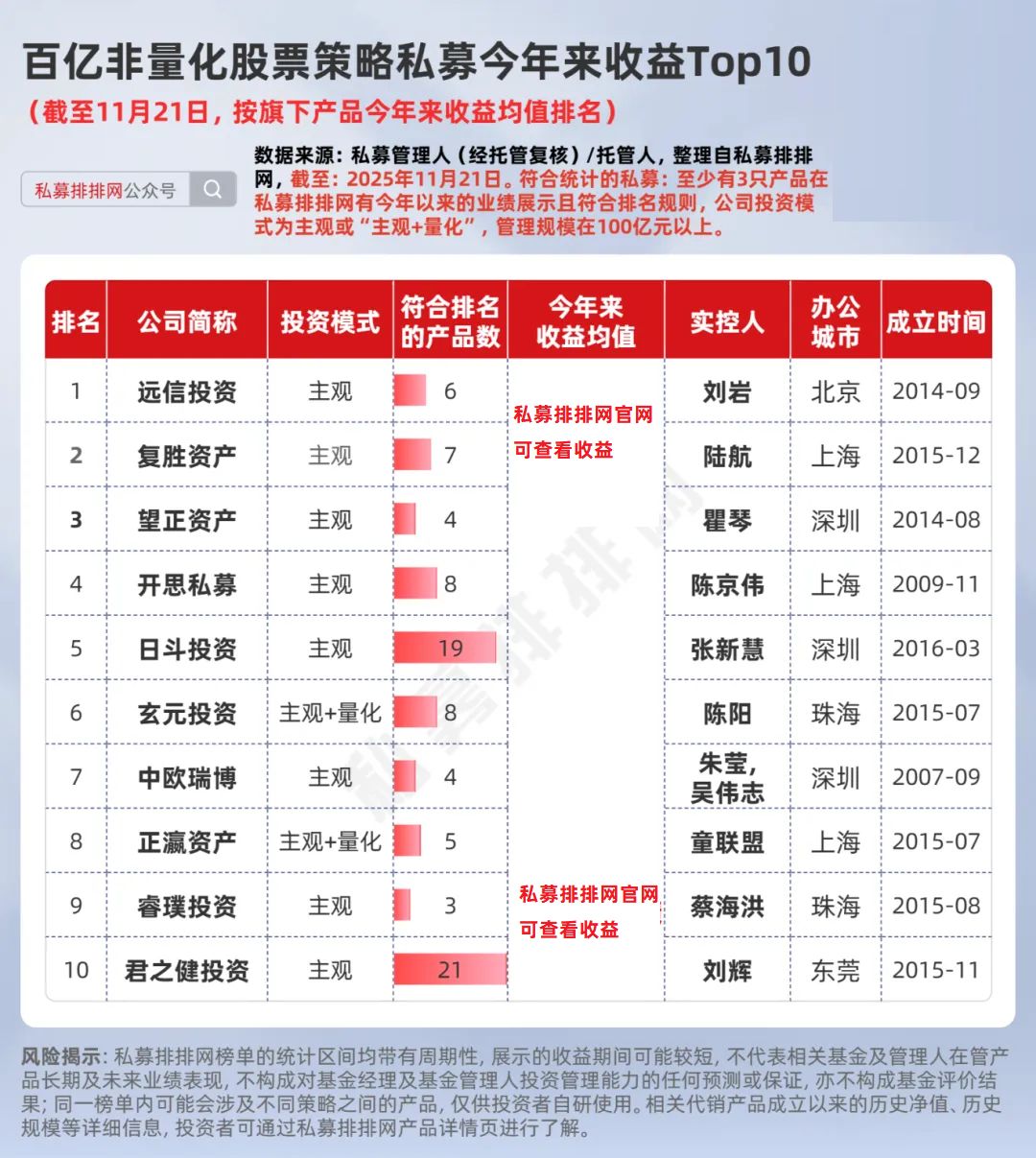 根据私募排排网数据(截至11月21日),今年来收益居前10的百亿非量化股票策略私募依次是:远信投资、复胜资产、望正资产、开思私募、日斗投资、玄元投资、中欧瑞博、正瀛资产、睿璞投资、君之健投资。