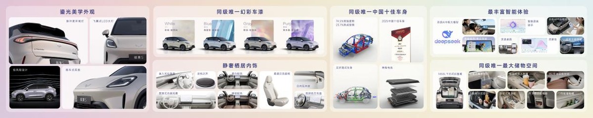 缤果S将50W风冷无线充电、无钥匙进入+智能上下电、飞翼式LED大灯+雨量感应式雨刮、6扬声器+阿嘉米斯声场调校、鎏光幻彩车色、75kW高效能水冷扁线电机等多重实用配置及同级唯一中国十佳车身统统标配,实现入门即高配!