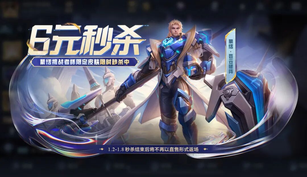 蒙恬的挑战者杯限定皮肤苍云破阵,将于1月2日开启秒杀。